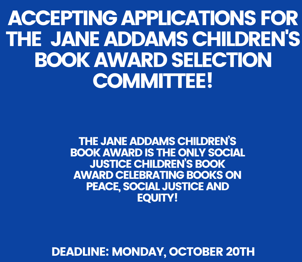 The Jane Addams Peace Association seeks selection committee members with diverse perspectives and identities among parents, teachers, librarians, activists, and child advocates, all with knowledge of children’s literature. The committee is composed of nine to twelve people serving three-year terms. Members read widely throughout the year, communicate via an online platform, and meet virtually monthly.