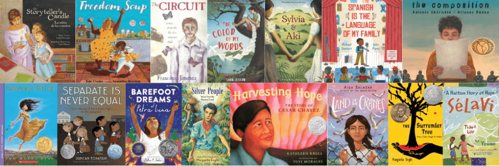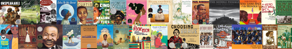 The books underneath each seal have received both the award listed and are a Jane Addams Children’s Book Award winner, honoree, or finalist.